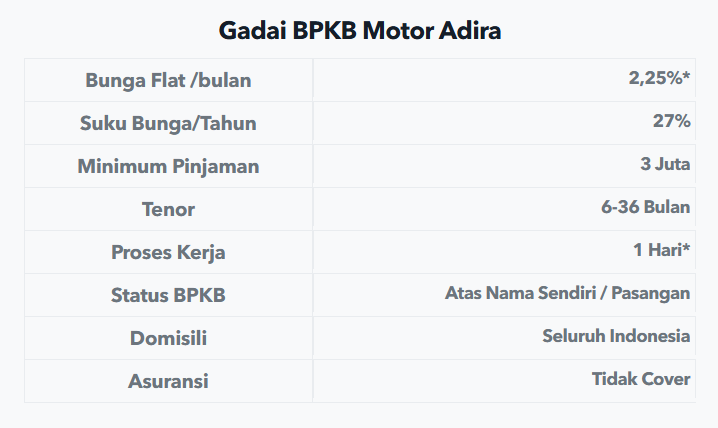 Layanan Adira Finance sangat membantu saya dalam mendapatkan dana untuk renovasi rumah. Prosesnya cepat dan mudah, sangat direkomendasikan untuk kebutuhan finansial.